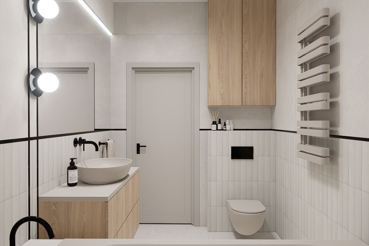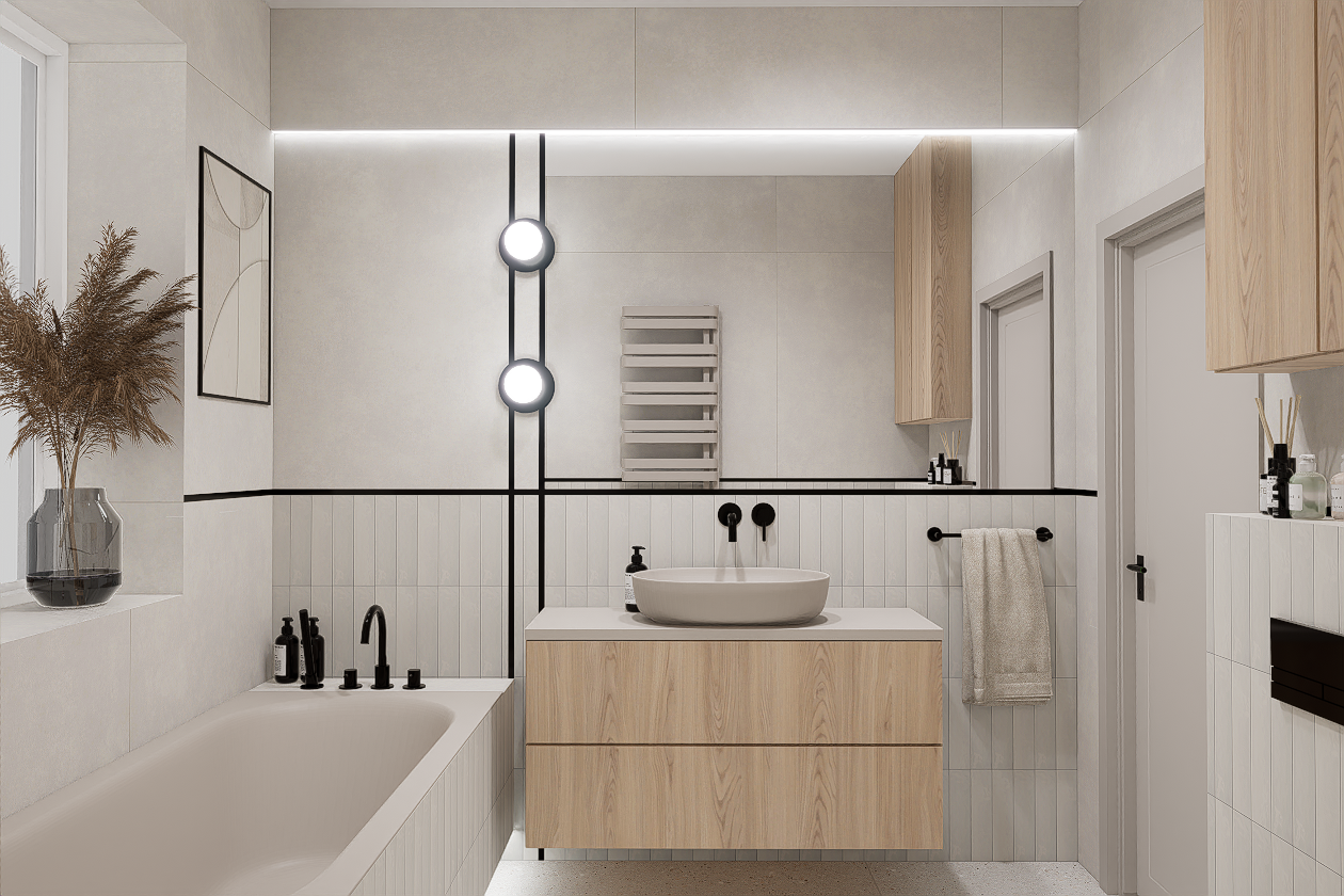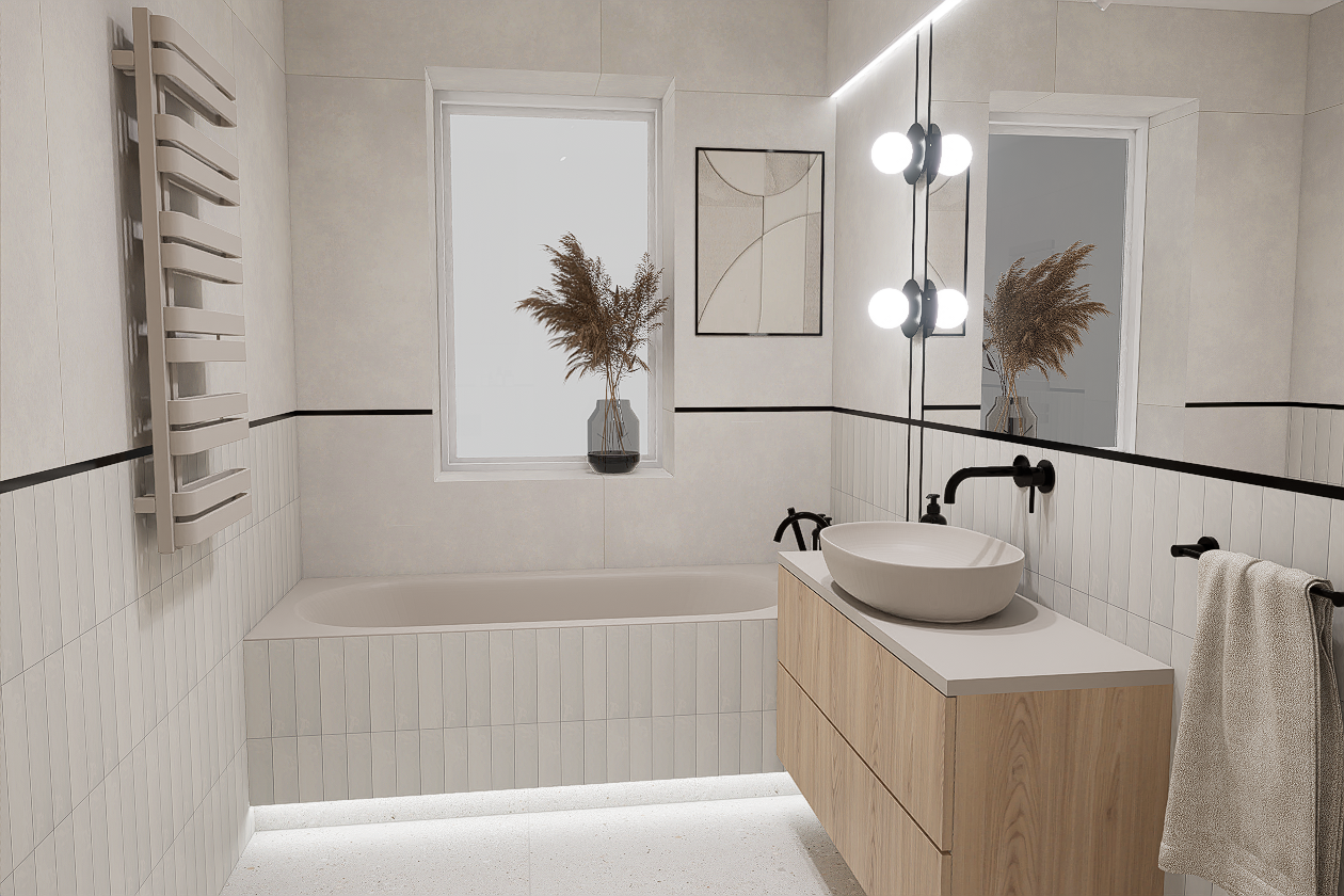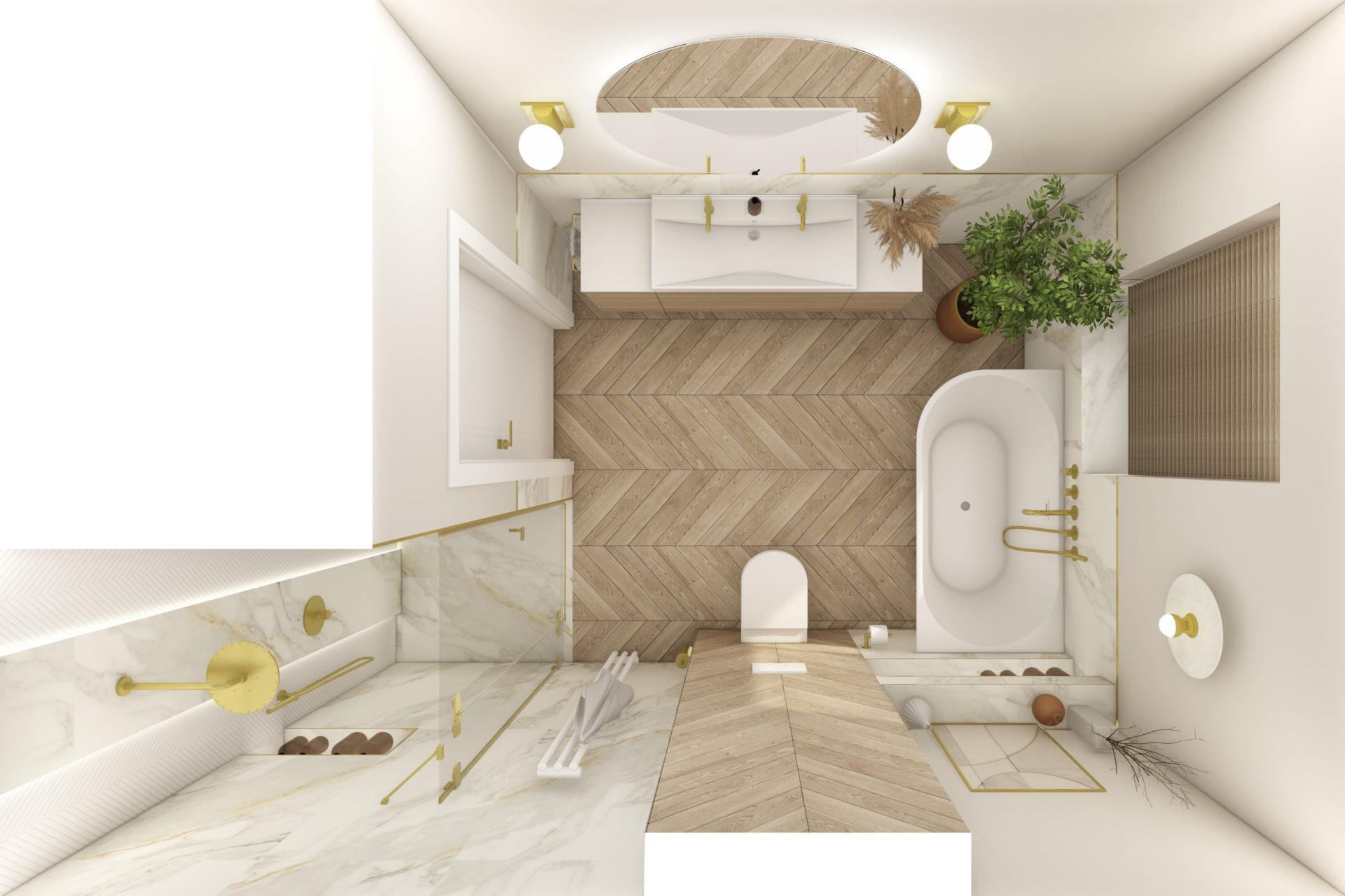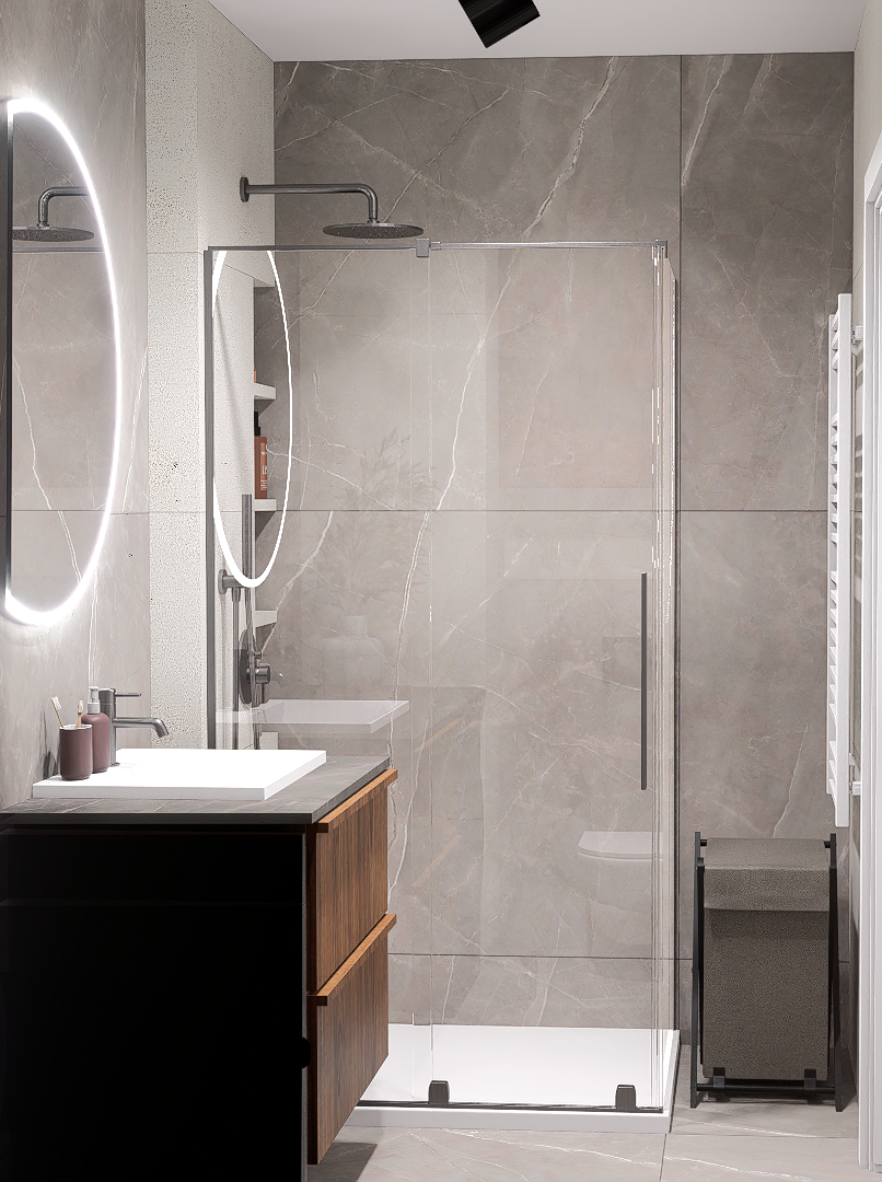 W pierwszej kolejności potrzebne będą dokładne wymiary pomieszczenia – możesz powierzyć to nam i umówić się na pomiar, lub samodzielnie pomierzyć łazienkę. Kolejnym etapem jest dobór materiałów i elementów wyposażenia – wszystko nanosimy w programie do projektowania 3D, a następnie przygotowujemy fotorealistyczną wizualizację Twojej łazienki.
